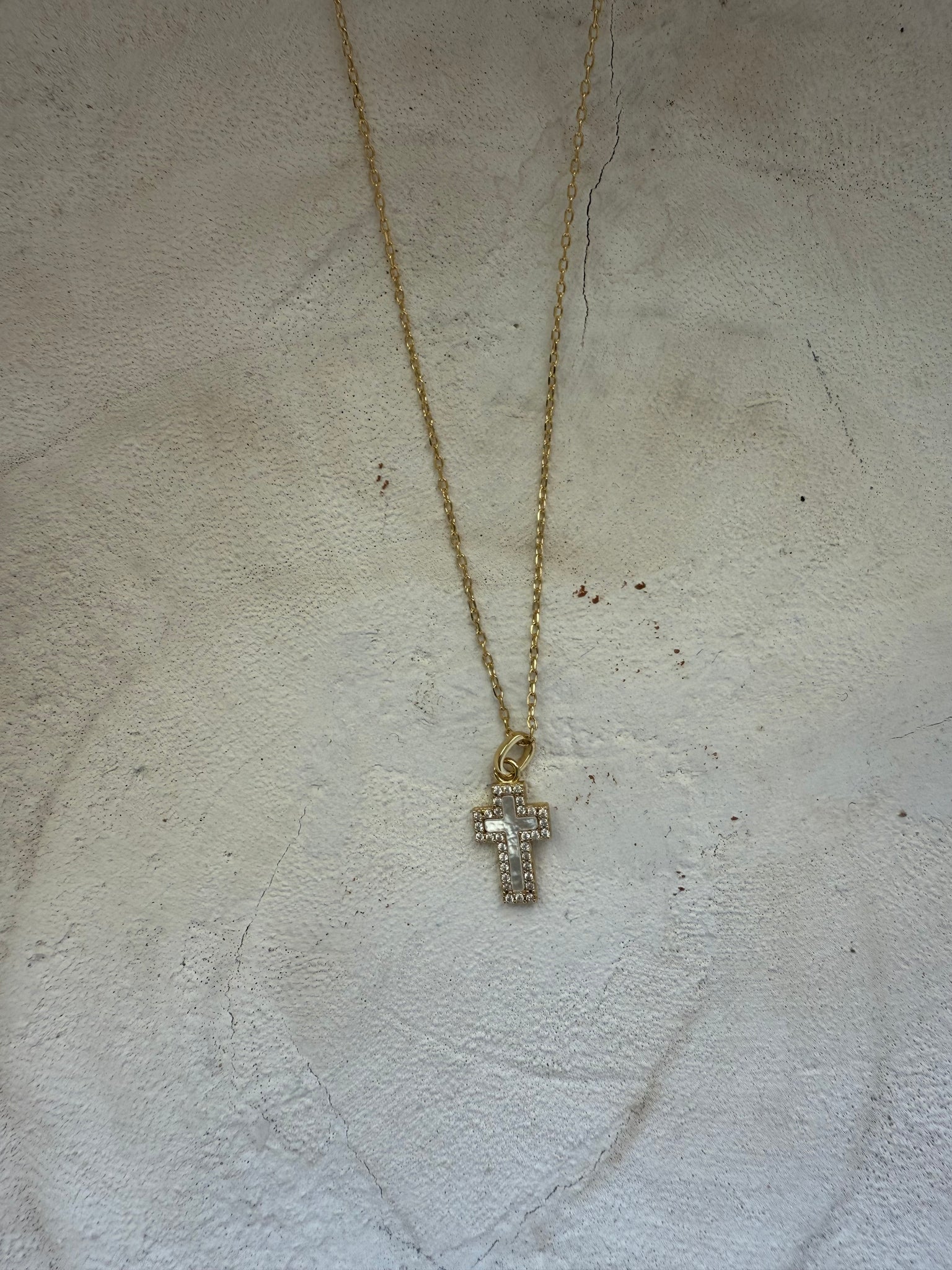 A timeless symbol with modern sparkle. The Pavé Cross Necklace features a classic cross pendant adorned with shimmering cubic zirconia stones, set on a fine 18K gold-plated chain. Its refined design makes it perfect for everyday wear while still adding a touch of radiance to any look.