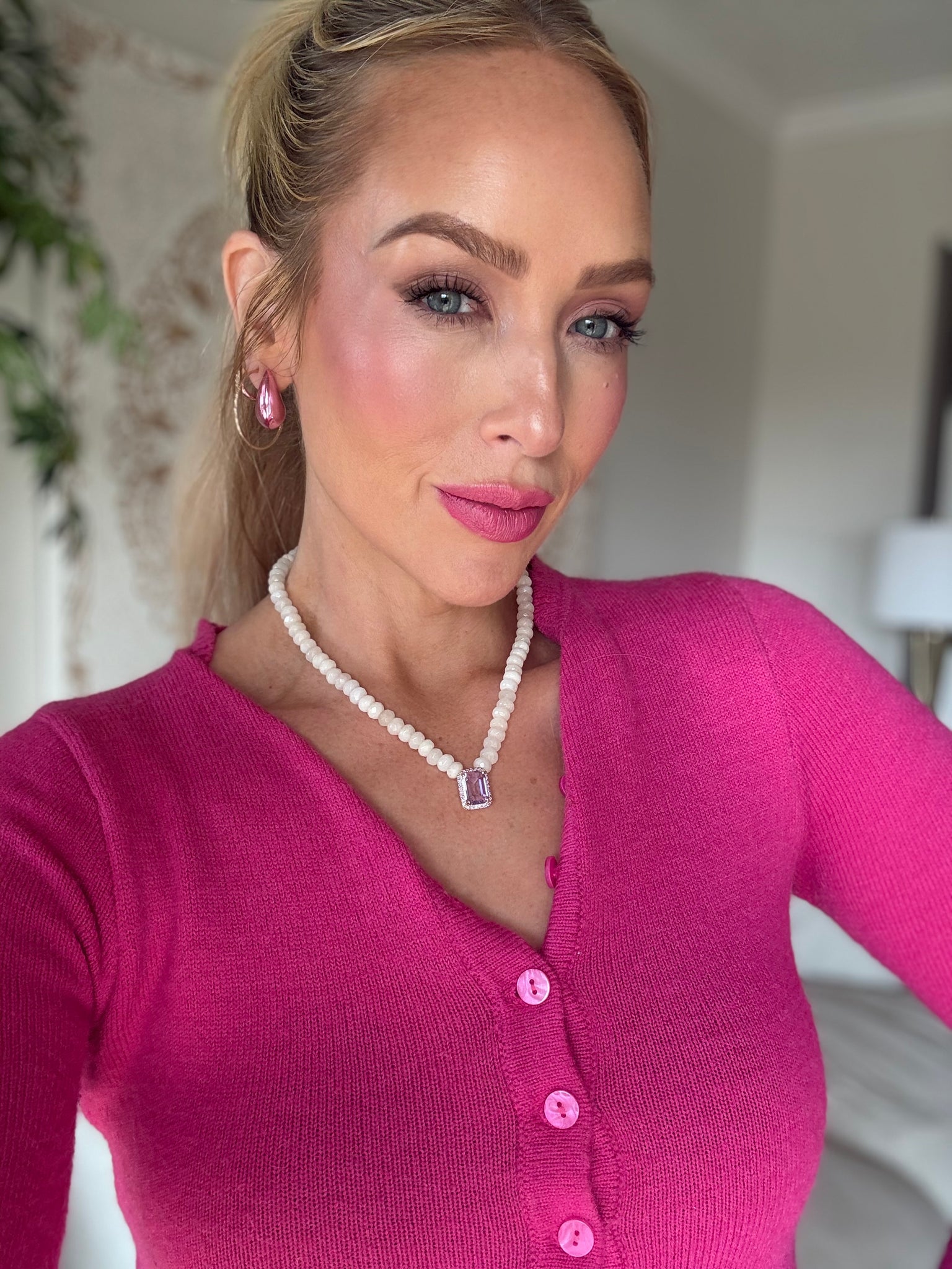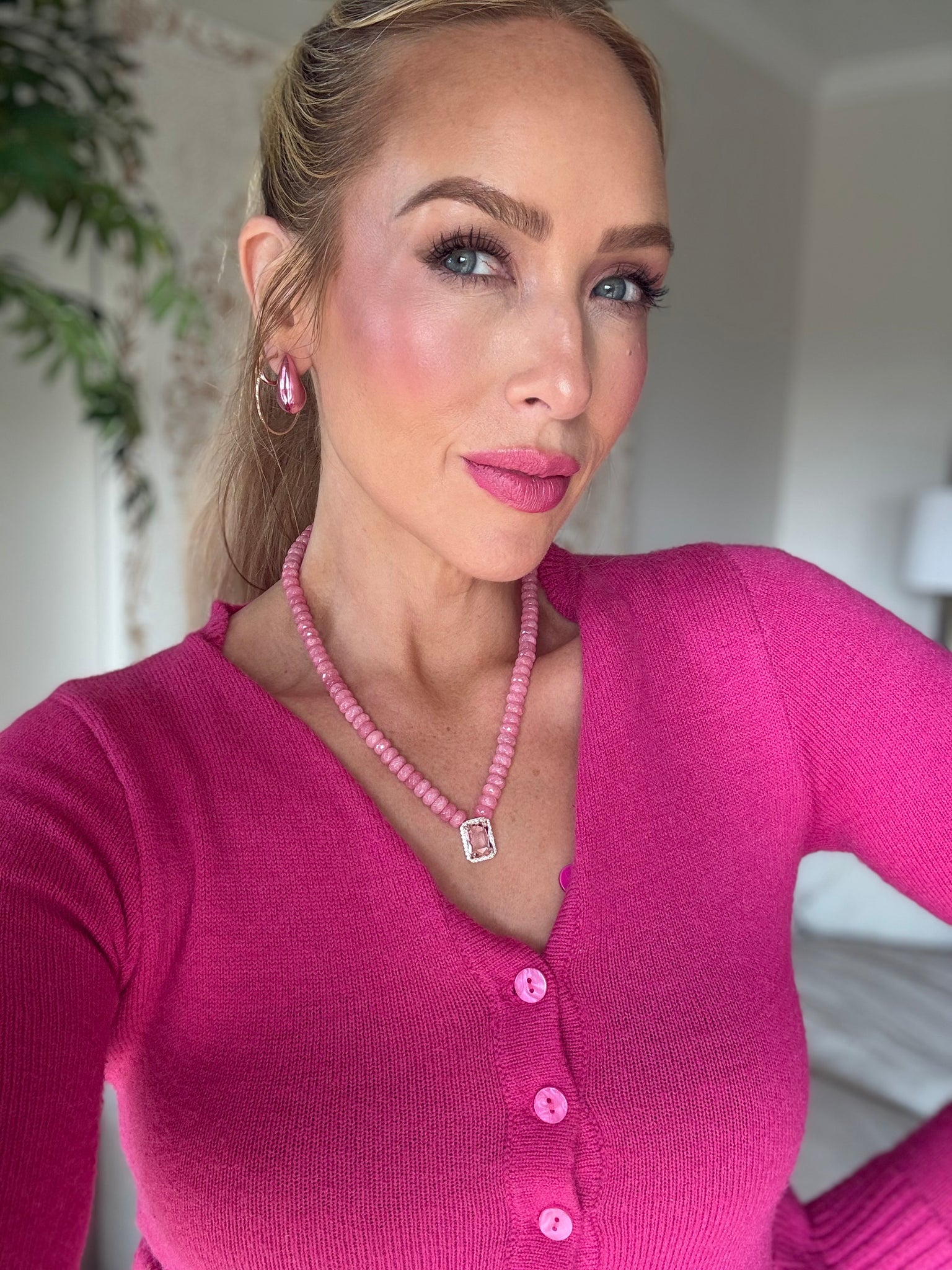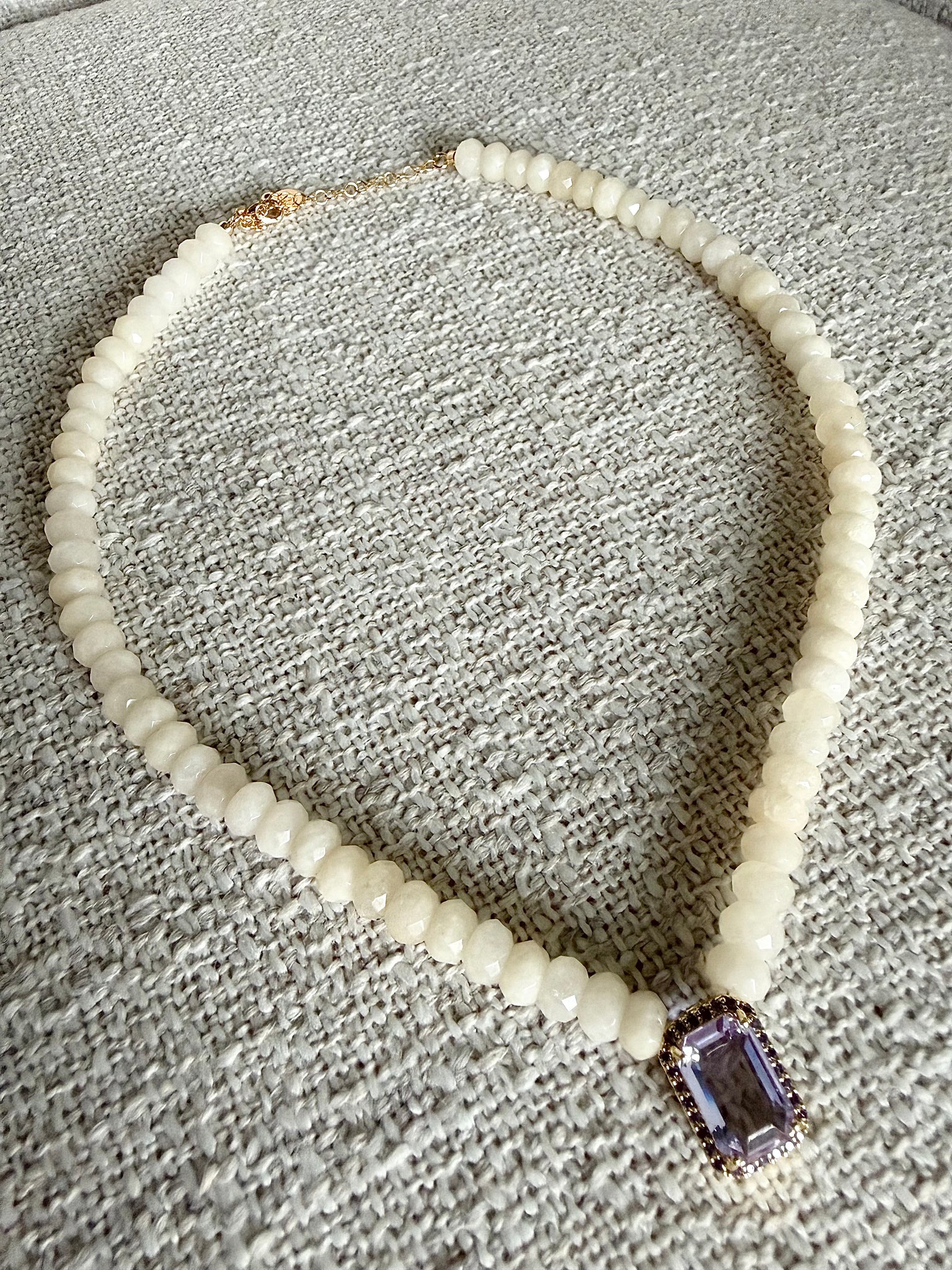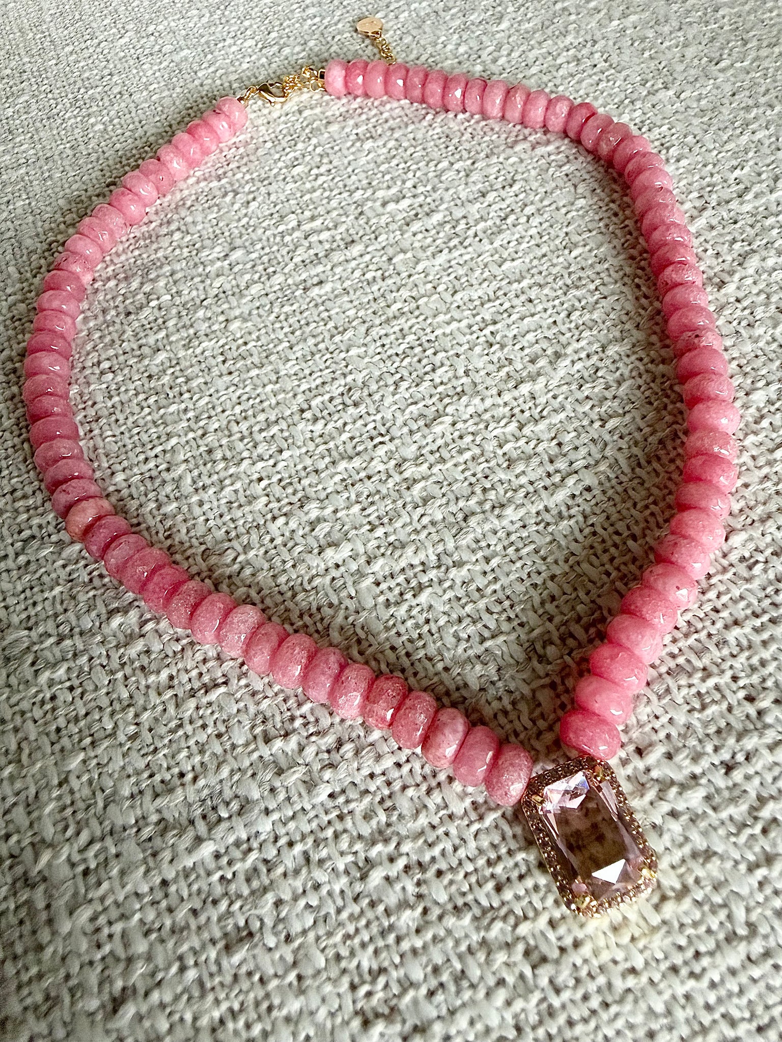 The Royal Stone Necklace features faceted beads that catch the light beautifully, finished with a rectangular crystal pendant framed in delicate gold detailing. The combination of soft pink or creamy ivory tones with the elegant gemstone centerpiece creates a look that is both feminine and refined.